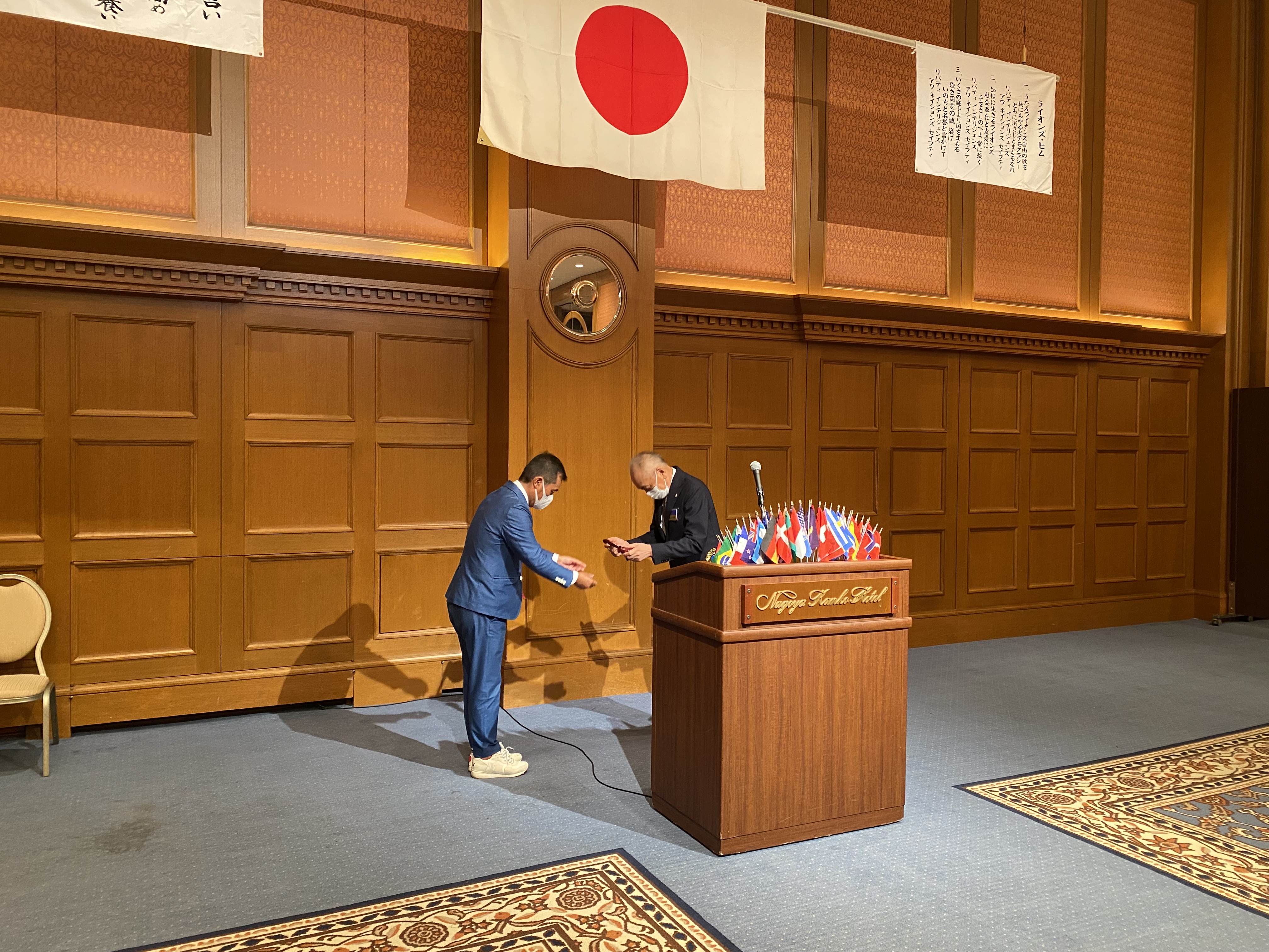古川会長の開会宣言&開会のゴング、そして会長挨拶があり、MJF$1000献金のピンが8人のライオンに贈呈されました。